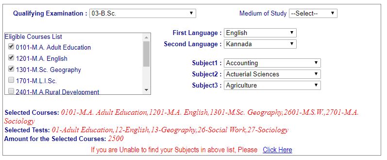 - In the registration form, candidates have to select the course they have passed at the graduation level and select the subjects and the list of eligible courses will appear on its own