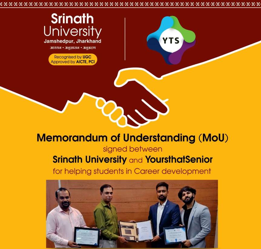 July 9, 2024: Srinath University and YOURSTHATSENIOR have signed a Memorandum of Understanding (MOU) to enhance the employability skills of students and support career advancement. Subhadeep Bhadra, Srinath University’s Director for Training and Placement, and Mr. Mohit Kadayan, CEO and Founder of YOURSTHATSENIOR have signed the MOU which includes the following points: