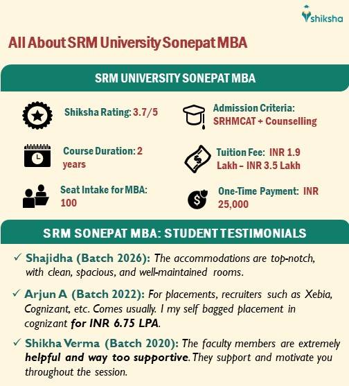SRM University Sonepat MBA is a two-year MBA course offered in eight major specialisations. Finance & Accounting, Artificial Intelligence and Machine Learning, International Business, Operation Management, Marketing & Digital Marketing, Logistics & Supply Chain Management, etc. are the MBA specialisations offered by the University. Finf below SRM University Sonepat MBA infographics: