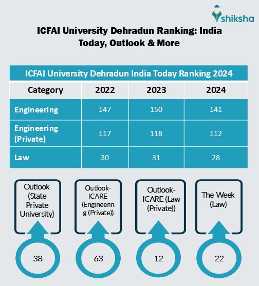 Consistently performing well in national rankings, ICFAI University Dehradun is recognized by leading rankings entities, including India Today, Outlook, Outlook-ICARE, Times Higher Education, Times, The Week, etc. across various categories. These rankings showcase the institution's achievements over the years. For further details on The ICFAI University, Dehradun rankings, go through the details provided below.