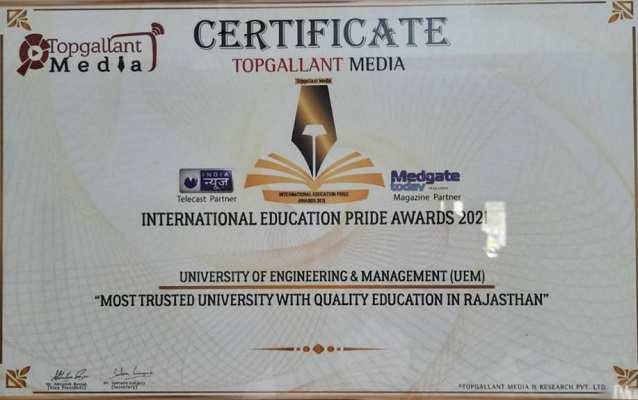 March 25, 2021: Topgallant Media, in partnership with AAJ TAK International, India News & News1 India, Medgate Today, and Forbes India Magazine, has awarded the University of Engineering and Management (UEM), Jaipur the International Education Pride Award 2021 for becoming the "Most Trusted University With Quality Education In Rajasthan."