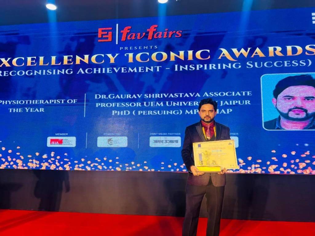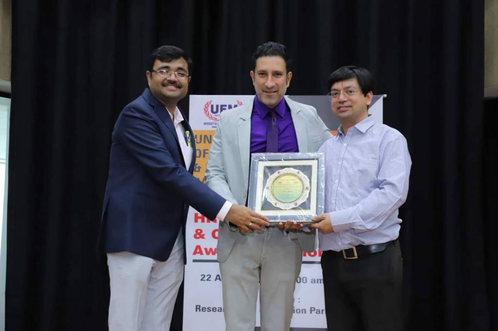 Professor Dr Anurag Hamilton and Professor Ashutosh Gautam accepted the award on behalf of members of the UEM Jaipur family.