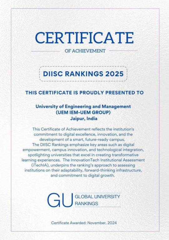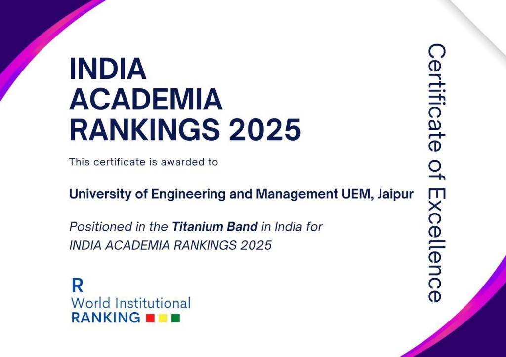 June 10, 2024: The University of Engineering & Management (UEM), Jaipur, proudly announces its ranking in the DIAMOND BAND as an INSTITUTION OF PROMINENCE for its commitment to offering Outcome-Based Education (OBE). At UEM, the belief in the significance of practical skills alongside academic excellence is deeply rooted. The recognition reflects the dedication of the faculty and the exemplary practical skills demonstrated by the students. The UEM Jaipur family gratefully accepts blessings and well-wishes.