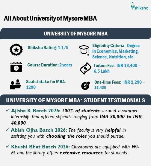 MBA at Mysore University is offered under the umbrella of the Faculty of Commerce. This two-year PG course is offered in Agribusiness Management specialisation apart from the general MBA. Admission to the PG programme is entrance-based. Candidates seeking admission to Mysore University MBA course require a valid Karnataka PGCET score or any other national-level exam scorecard to apply. The guidelines for University of Mysore MBA admissions are prescribed by the University and Government of Mysore. For more information, candidates can refer to the following Mysore University MBA infographic: