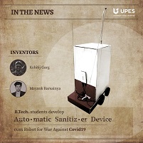 April 22, 2020: Mayank and Kshitij, BTech students of UPES - University of Petroleum and Energy Studies design a fully automated sanitizer machine amid the lockdown situation with minimum resources available. With a lot of students countrywide experimenting and developing innovative products to contain the spread of novel Coronavirus, students of UPES also saw this period as an opportunity to contribute to society. Apart from sanitising, this mini robot also can function as a communication system between medical staff and infected patients by helping them deliver masks and medicine in quarantine wards while maintaining social distancing. Also, it can be used a patrolling machine to the containment zones to identify the defaulters.