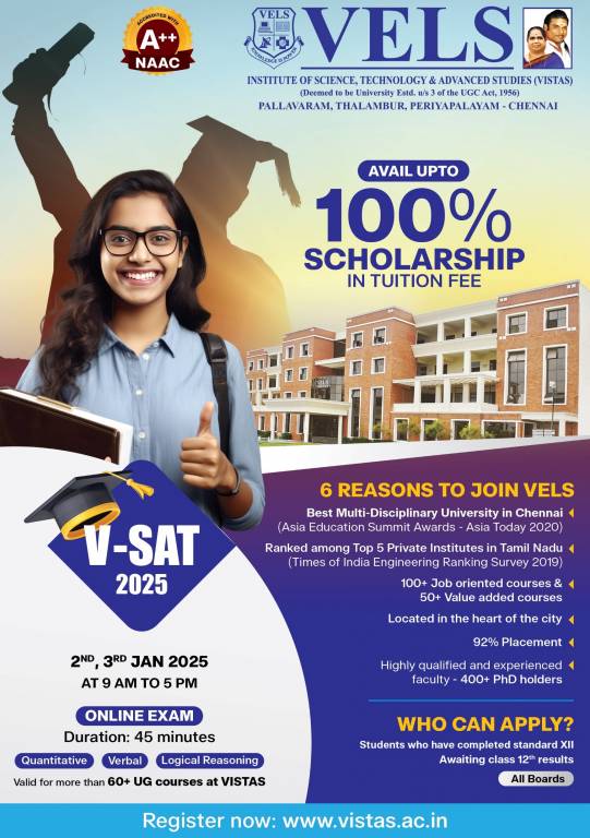 July 16, 2020: Chennai based Engineering and Higher studies institute, VELS Institute of Science, Technology and Advanced Studies (VISTAS) is offering upto 100 per cent sholarships to students aspiring admission in any of the undergraduate programmes at their institute. These scholarships are being offered to students on the basis of thei