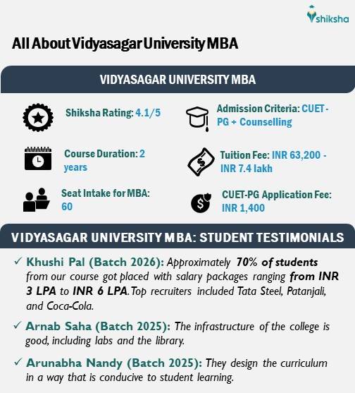 Vidyasagar University MBA is a postgraduate degree level course that lasts for two years. The programme is offered in three major specialisations in the domain of Finance, Marketing, and Human Resource Management in dual specialization mode. The university also offers PhD in management. Candidates can find below the MBA infographic below: